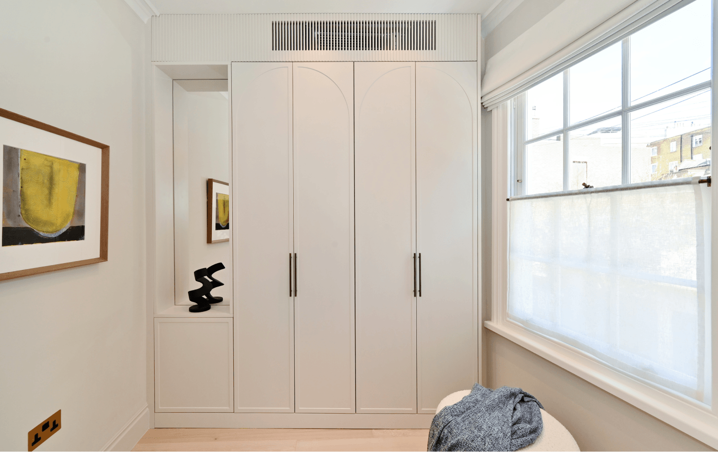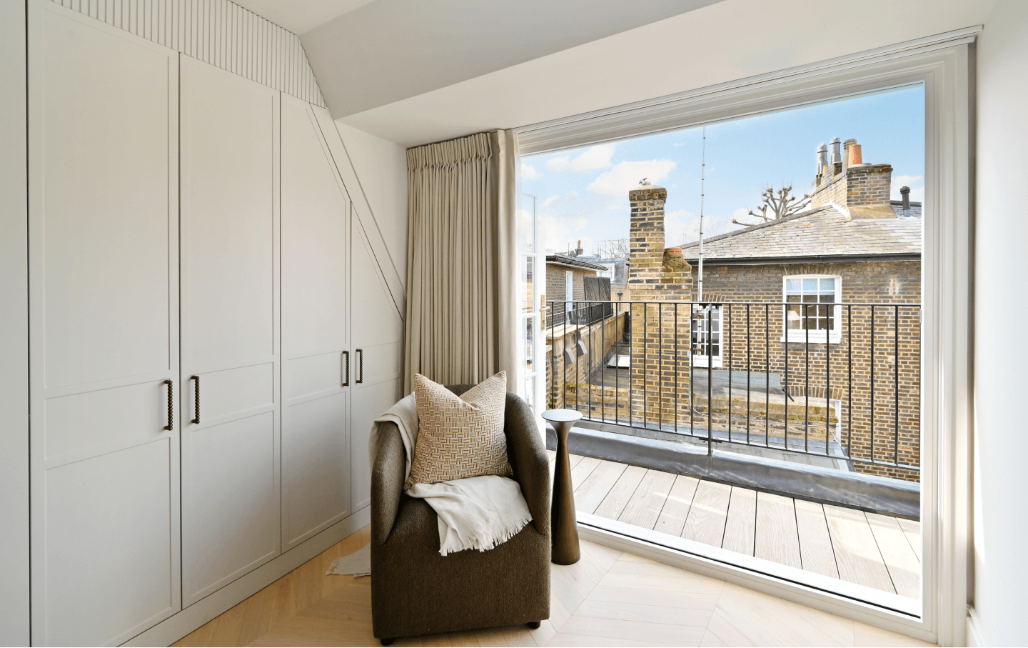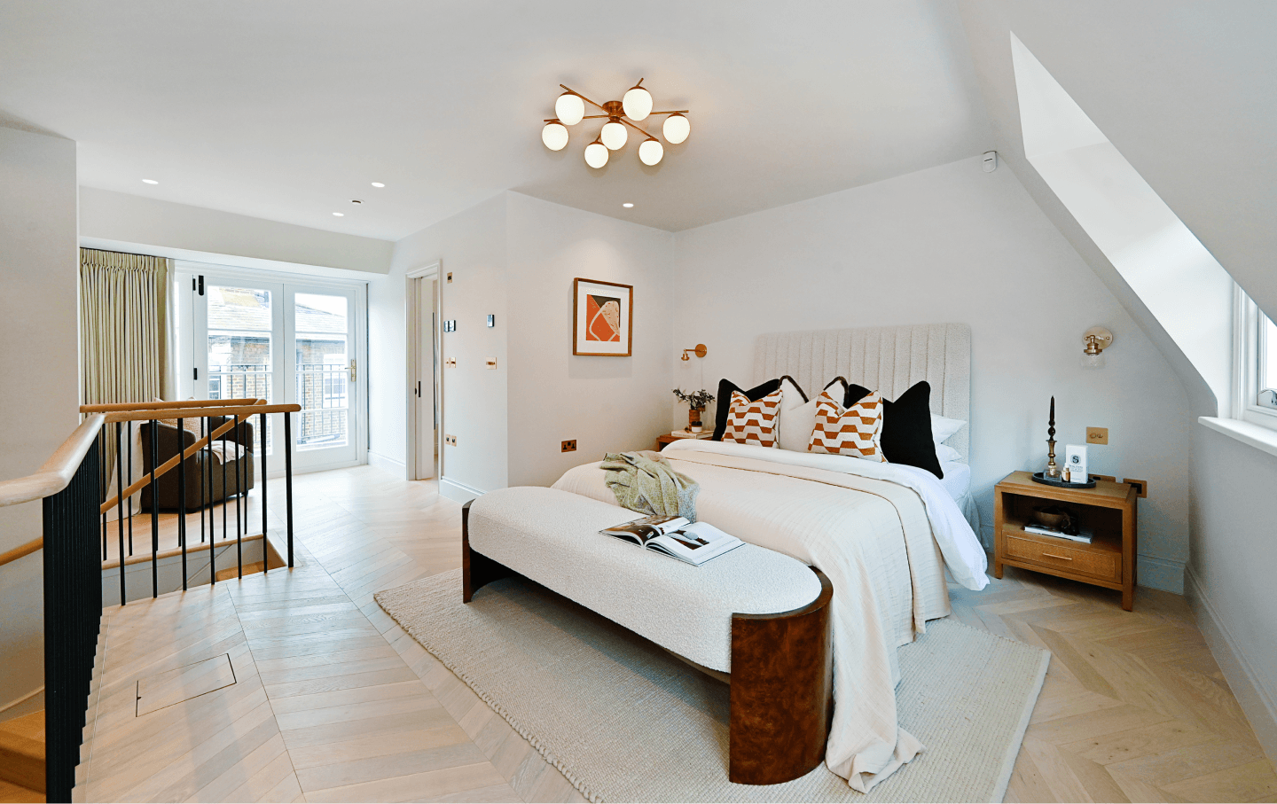 Occupying the entire top floor, the principal suite is conceived as a private retreat. Tailored wardrobes with an integrated dressing table enhance the sense of understated luxury, while light oak chevron flooring draws the eye toward a Violetta marble en-suite bathroom. Bi-fold doors open to a charming balcony inviting natural light and greenery inside, reinforcing the home’s connection to its tranquil surroundings.