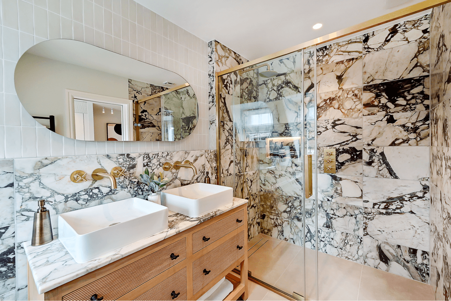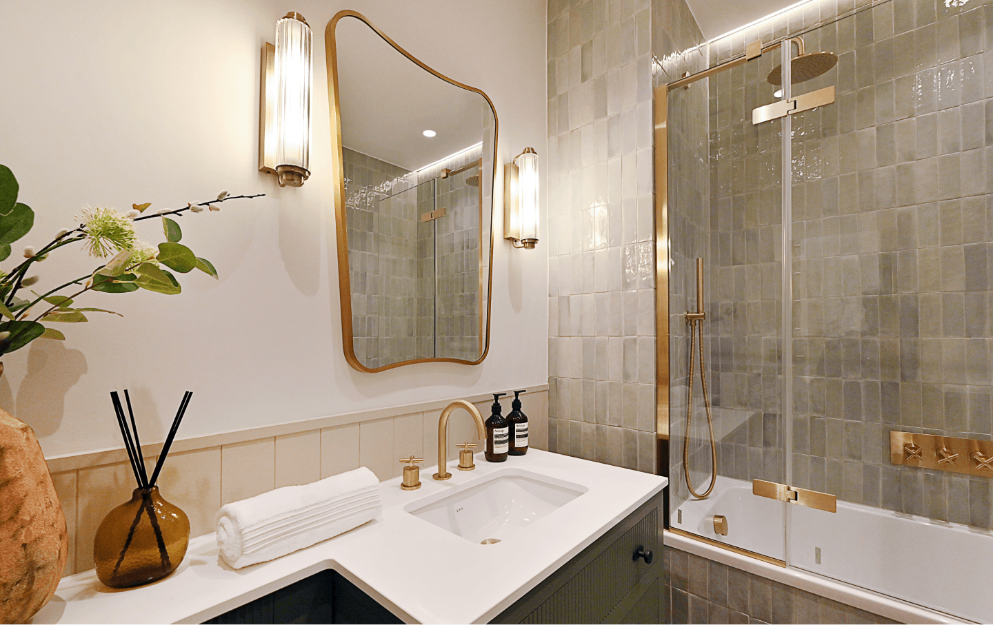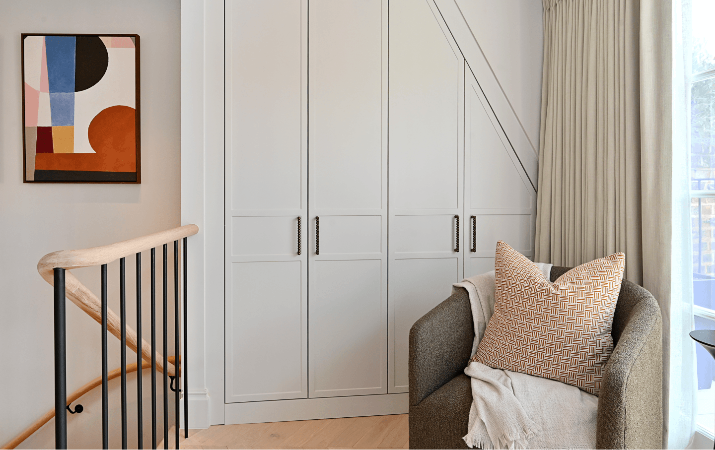 Occupying the entire top floor, the principal suite is conceived as a private retreat. Tailored wardrobes with an integrated dressing table enhance the sense of understated luxury, while light oak chevron flooring draws the eye toward a Violetta marble en-suite bathroom. Bi-fold doors open to a charming balcony inviting natural light and greenery inside, reinforcing the home’s connection to its tranquil surroundings.