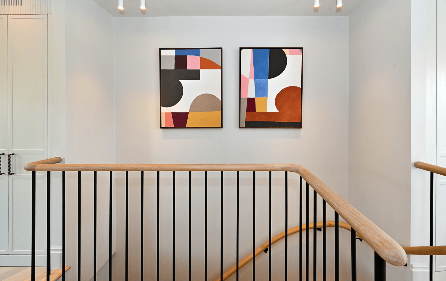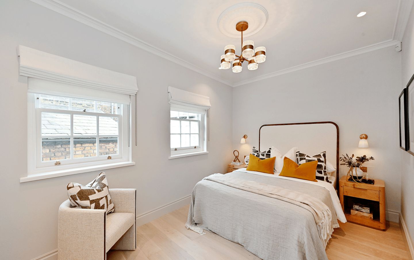 A sculptural, handcrafted staircase-featuring a curved oak handrail and metal balustrade-provides a striking architectural focal point, leading to the upper floors. Each bedroom is curated with a focus on comfort and style, complete with custom joinery and considered designer lighting.