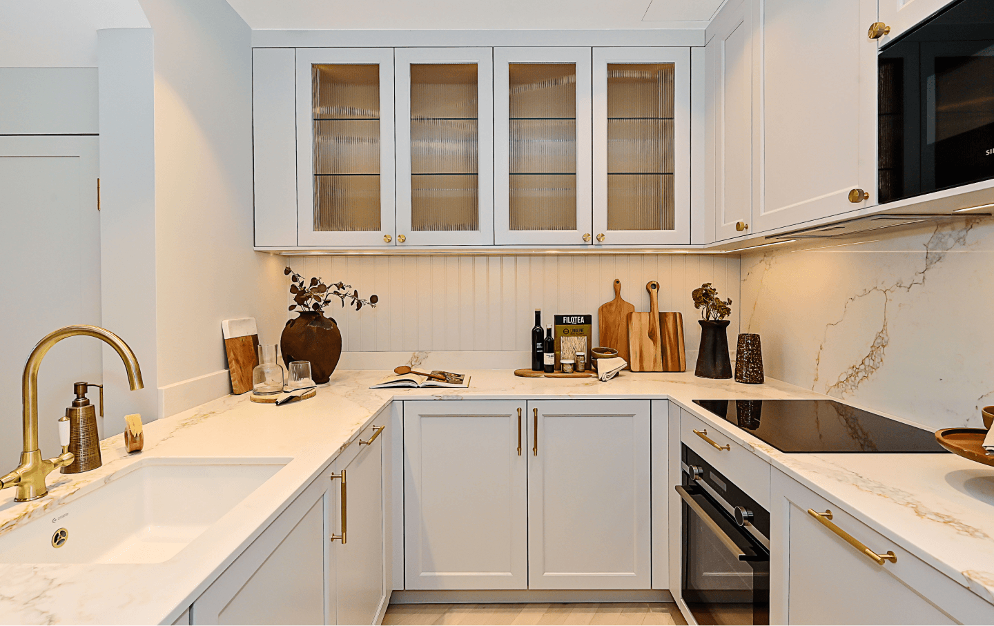 Within the living area, relaxed seating transitions effortlessly into a dedicated dining setting, anchored by a bespoke kitchen. Here, shaker-style and bevelled glass cabinetry are paired with fully integrated appliances and a marble-effect quartz worktop-subtly referencing traditional country aesthetics while maintaining a distinctly contemporary feel.