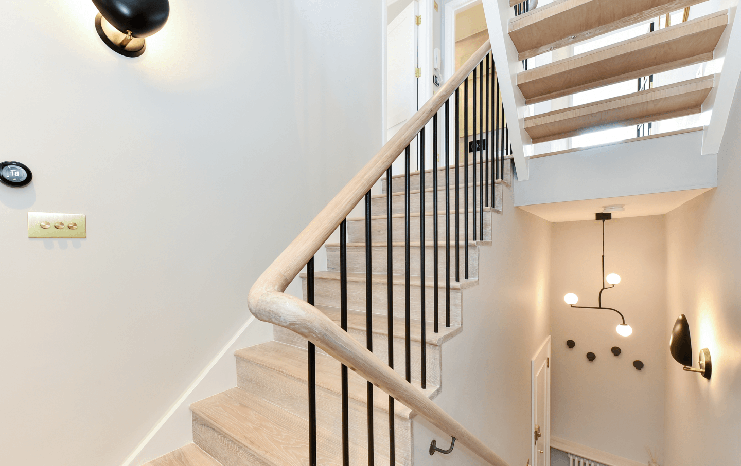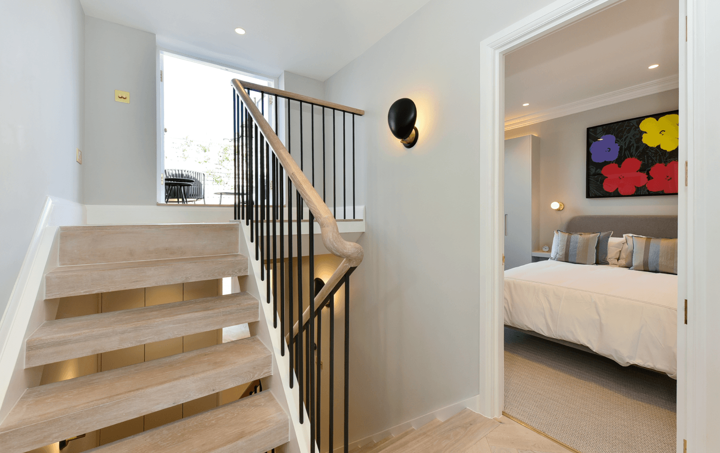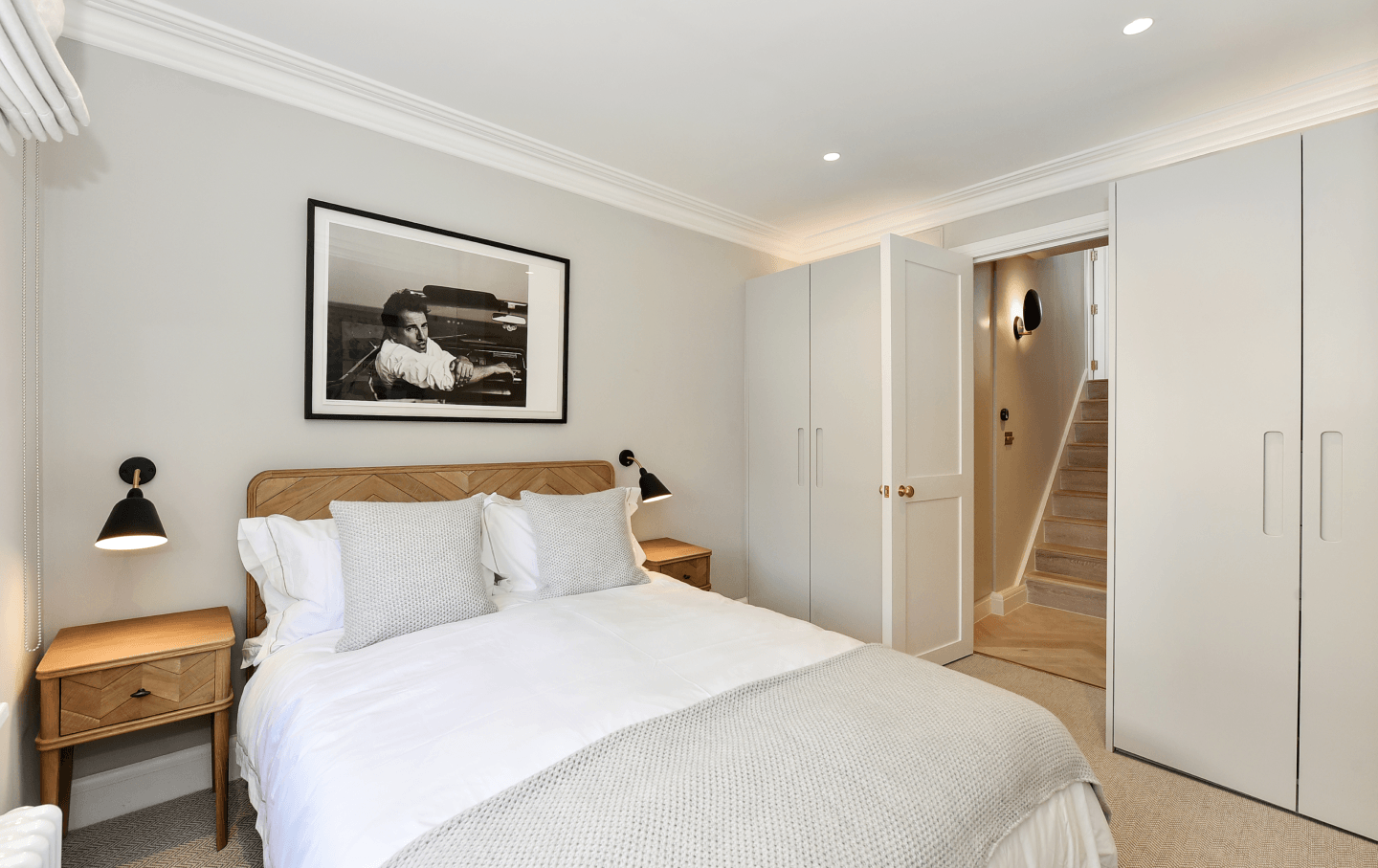 A striking timber staircase, featuring handcrafted oak and metal balustrade, connects the principal living spaces. Each double bedroom has been conceived as a private retreat, appointed with bespoke wardrobes, wall-mounted bedside lighting, classic column radiators, and plush carpeting underfoot.
