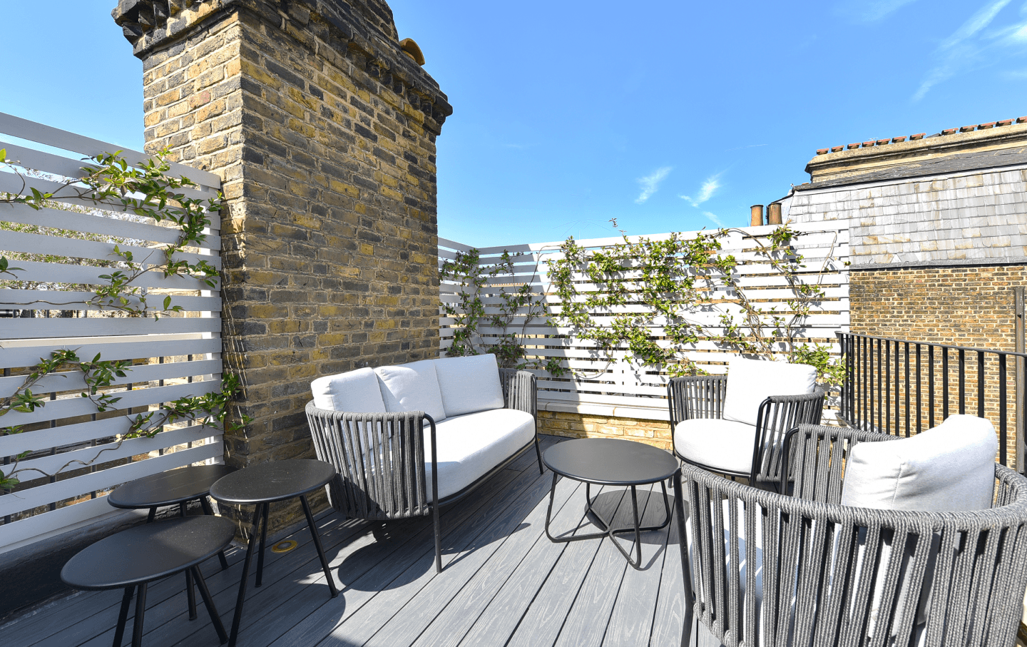 Above, a newly introduced roof terrace elevates the residence further. Finished with grey composite decking and complementary trellising woven with live jasmine, this private outdoor sanctuary offers a rare oasis within the urban fabric – an intimate extension of the interior living space.