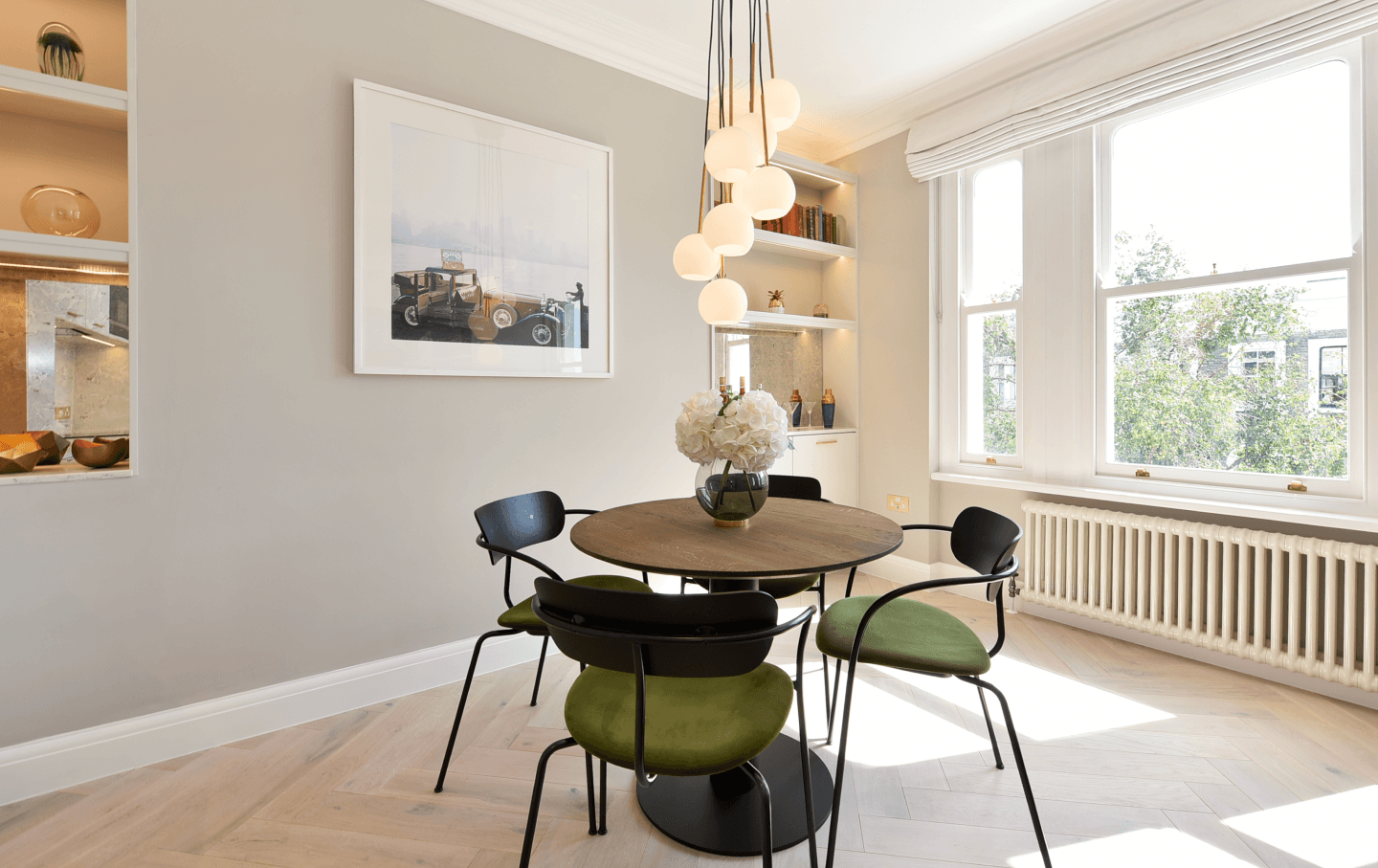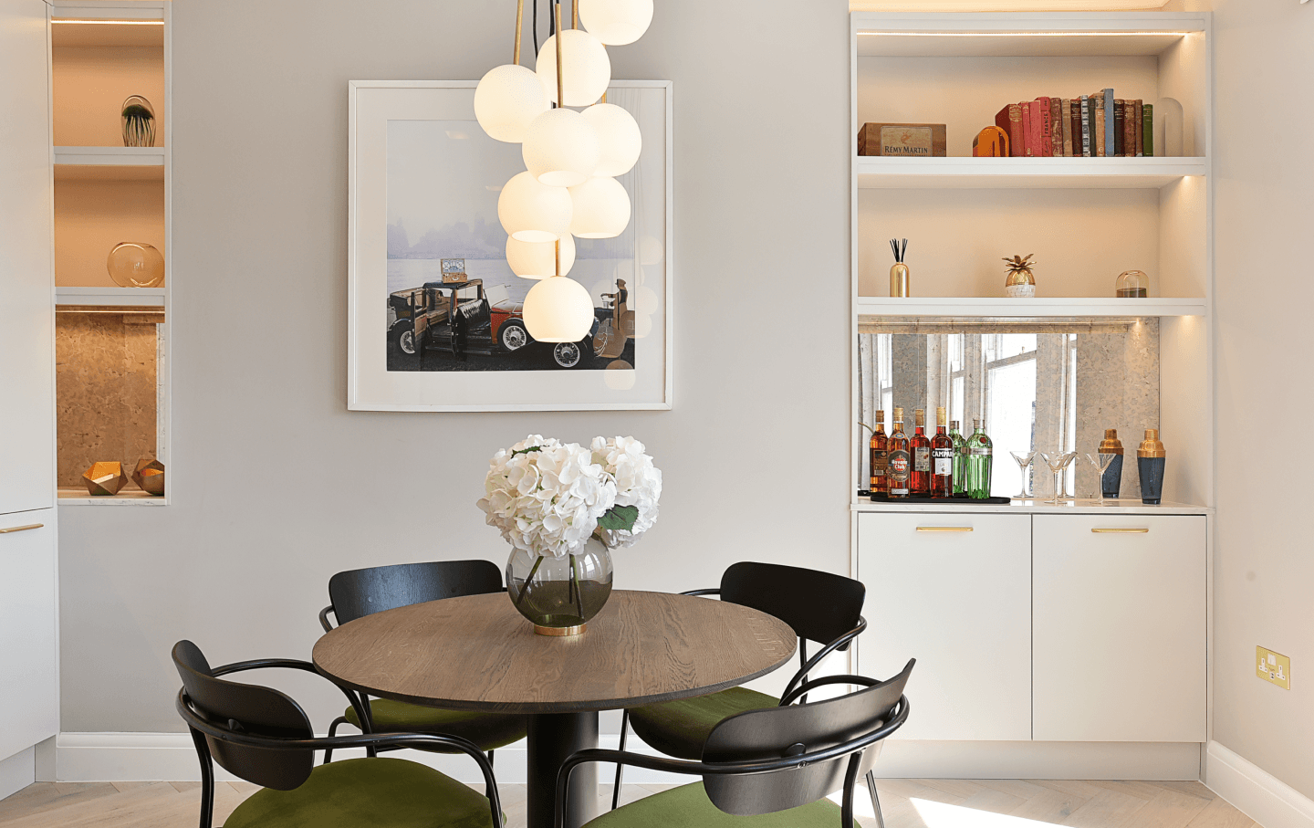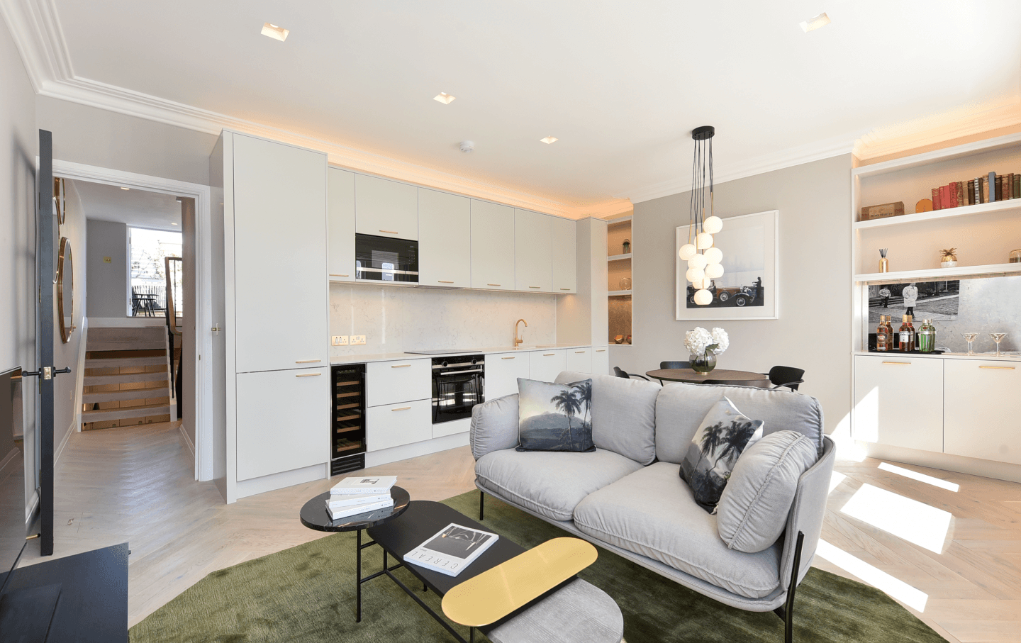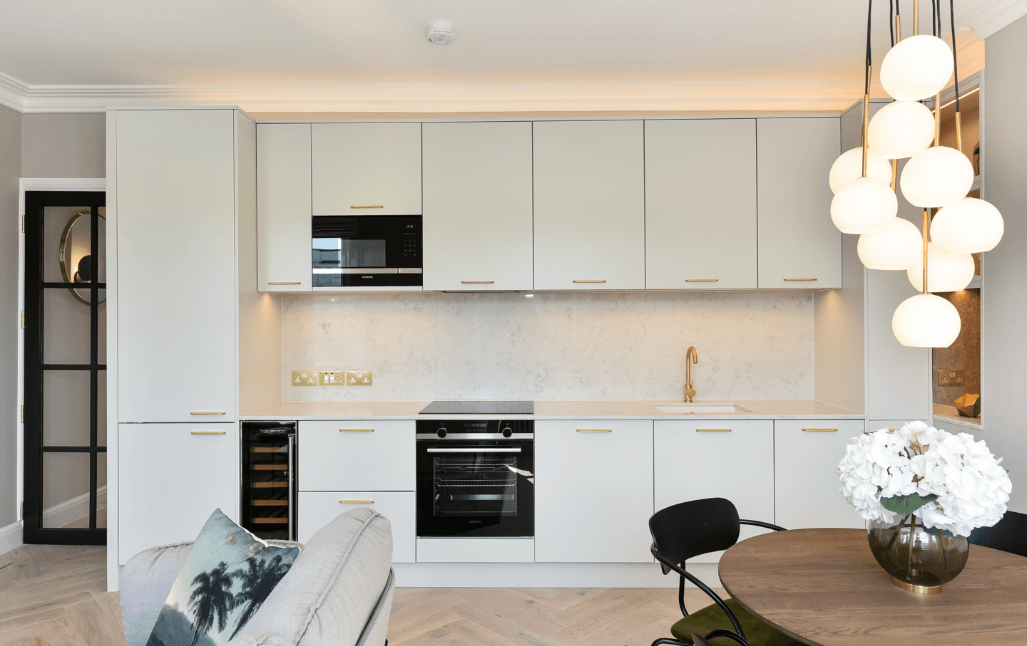 The reconfiguration centred on the creation of a generous open-plan reception, kitchen, and dining space – a seamless environment designed for both entertaining and everyday living. A bespoke integrated kitchen forms the architectural focal point, complete with sculpted stone worktops and splashback, and a full suite of Siemens appliances. Custom cabinetry with discreet LED illumination enhances depth and ambience, while curated decorative lighting, tailored soft furnishings, and hand-selected European furniture lend a sophisticated, layered finish.