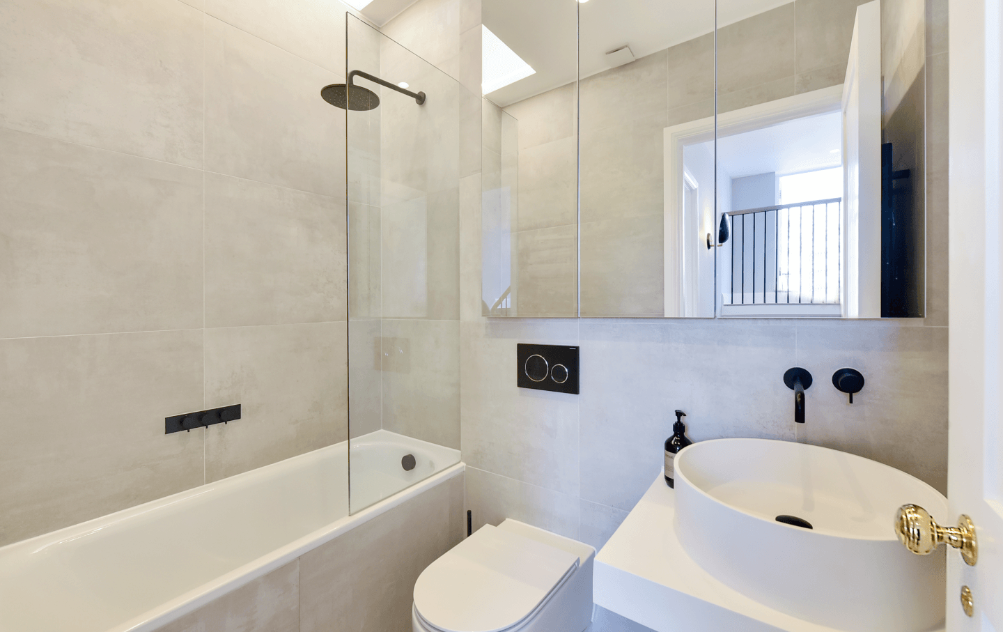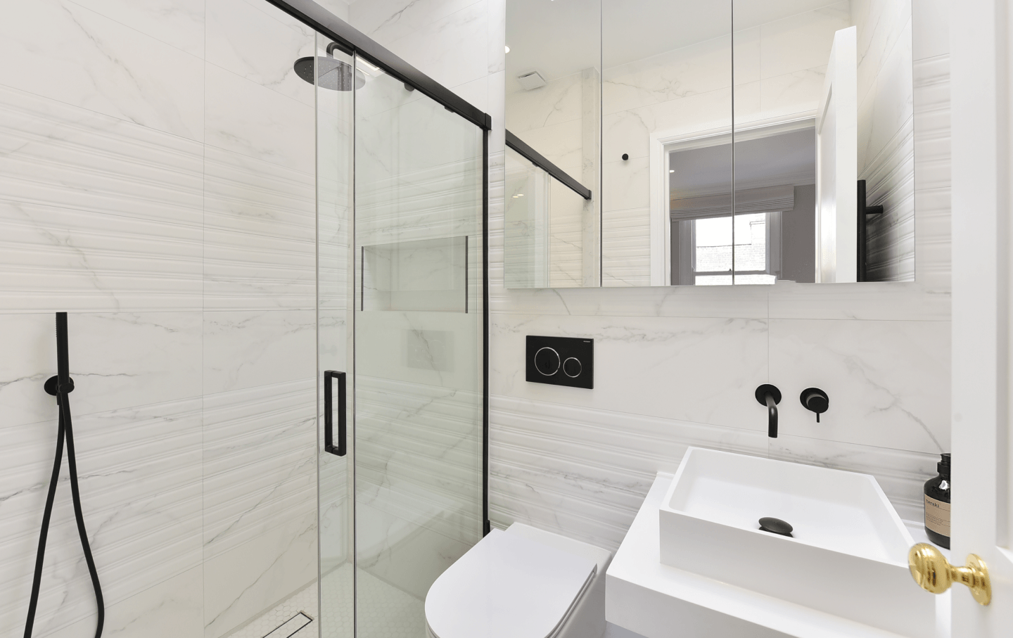 The bathrooms reflect a considered balance of classic and contemporary detailing. Italian tiling introduces texture and character, contrasted by matte black taps and valves, white resin basins, and bespoke mirrored cabinetry – creating spaces that feel both sculptural and serene.